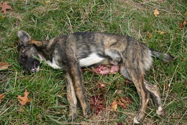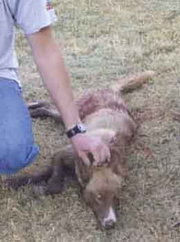 Coyotes and dogs often mate. It usually happens in the warmer climates like Texas and Oklahoma where the coyotes are plentiful and the breeding season is extended because of the warm weather. The puppies are a true menace to livestock and pets because of the domestic mix. They have wild side like the coyote, but are not as shy. They will kill pets and livestock for the fun of it, often not eating the remains. Another bad side of the mix is now the breeding cycle is confused. Wild animals like coyotes usually breed only once a year and domestic animals breed often. Female coydogs will breed year-round, producing many more pups than a wild coyote. Member Robert Admire sent these picture of some coydogs in Oklahoma. He said he often sees more coydogs than coyotes in his area. A distinguishable feature in a coydog is the ears and tail. Special thanks to Robert for these pictures.