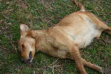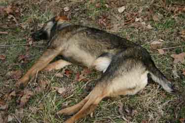 Coyotes and dogs often mate. It usually happens in the warmer climates like Texas and Oklahoma where the coyotes are plentiful and the breeding season is extended because of the warm weather. The puppies are a true menace to livestock and pets because of the domestic mix. They have wild side like the coyote, but are not as shy. They will kill pets and livestock for the fun of it, often not eating the remains. Another bad side of the mix is now the breeding cycle is confused. Wild animals like coyotes usually breed only once a year and domestic animals breed often. Female coydogs will breed year-round, producing many more pups than a wild coyote. Member Robert Admire sent these picture of some coydogs in Oklahoma. He said he often sees more coydogs than coyotes in his area. A distinguishable feature in a coydog is the ears and tail. Special thanks to Robert for these pictures.